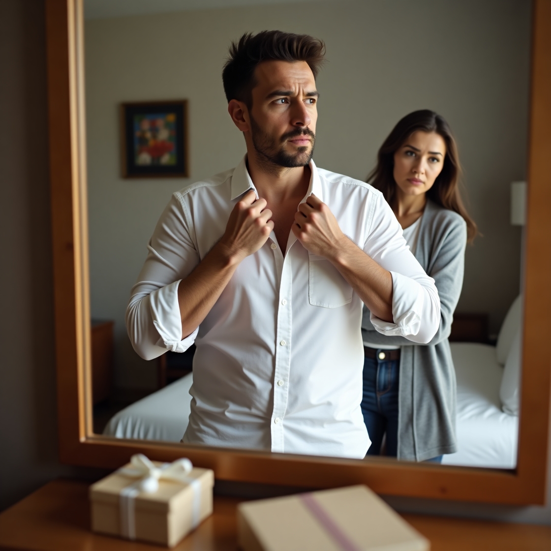 Алексей не ответил сразу. Продолжал стоять у зеркала, глядя на своё отражение. Потом развернулся, посмотрел на жену. В глазах мелькнуло что-то неуловимое. Смущение? Неловкость?