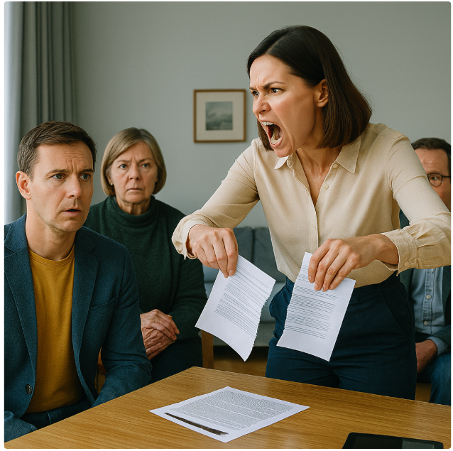 Ксения схватила стопку документов со стола. Кредитный договор, договор купли-продажи, справки, выписки. Всё в руках. Женщина посмотрела на мужа, на свекровь, на нотариуса. Потом разорвала документы пополам.