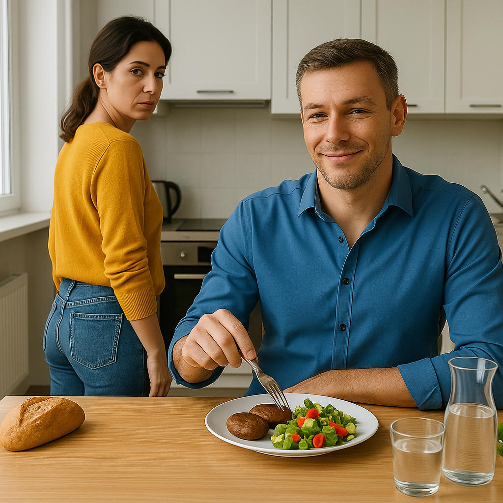 Я не села. Смотрела на его тарелку. На котлету, которую он резал, не поднимая глаз. На хлеб, который тащила от метро с двумя пакетами. На зелень — подорожала, но взяла, он же любит.