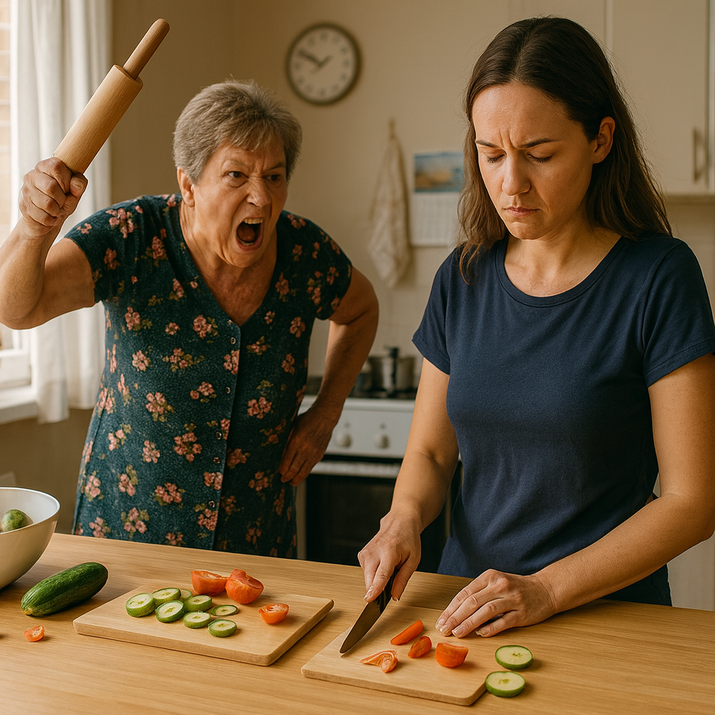 Когда я готовила ужин, свекровь оттолкнула меня скалкой по голове рявкнув: — Кто так режет, криворукая!