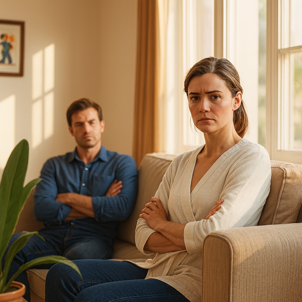 Андрей сидел на диване, сутулясь, словно школьник, пойманный на обмане. Вид у него был помятый: рубашка не застёгнута, волосы взъерошены, под глазами — тень бессонной ночи. Он поджал губы, потёр переносицу, но не двигался.