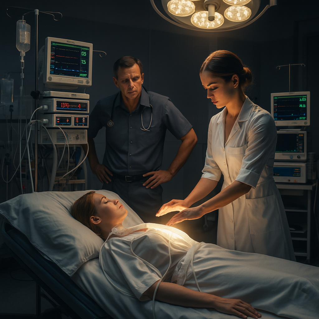 Новая медсестра сняла с рук перчатки и держала их над головой больной, а от её ладоней … исходило ясно видимое сияние!