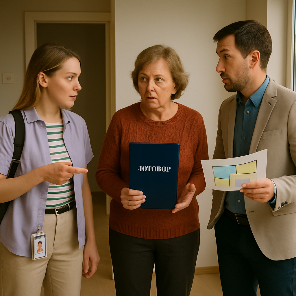 За столом сидели трое: Алла Викторовна, Максим и незнакомый мужчина лет сорока в строгом сером костюме. Перед ними лежали какие-то бумаги, папка с документами. Мужчина что-то объяснял, показывая на распечатки с фотографиями квартир.