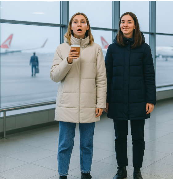 Из-за колонны вышли Алёна и Вика, в руках стаканчики с кофе из автомата.