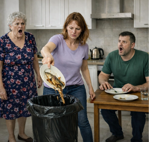 Марина взяла его тарелку — ту, на которой ещё оставалась рыба, — и понесла к мусорному ведру. Виктор проводил её взглядом, не понимая. Марина открыла крышку и вытряхнула туда всё содержимое. Рыба упала с глухим стуком.