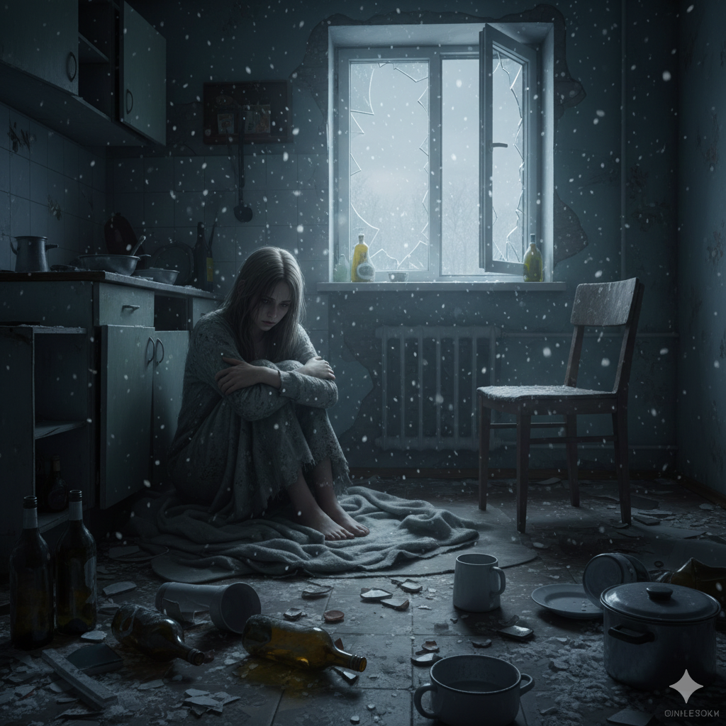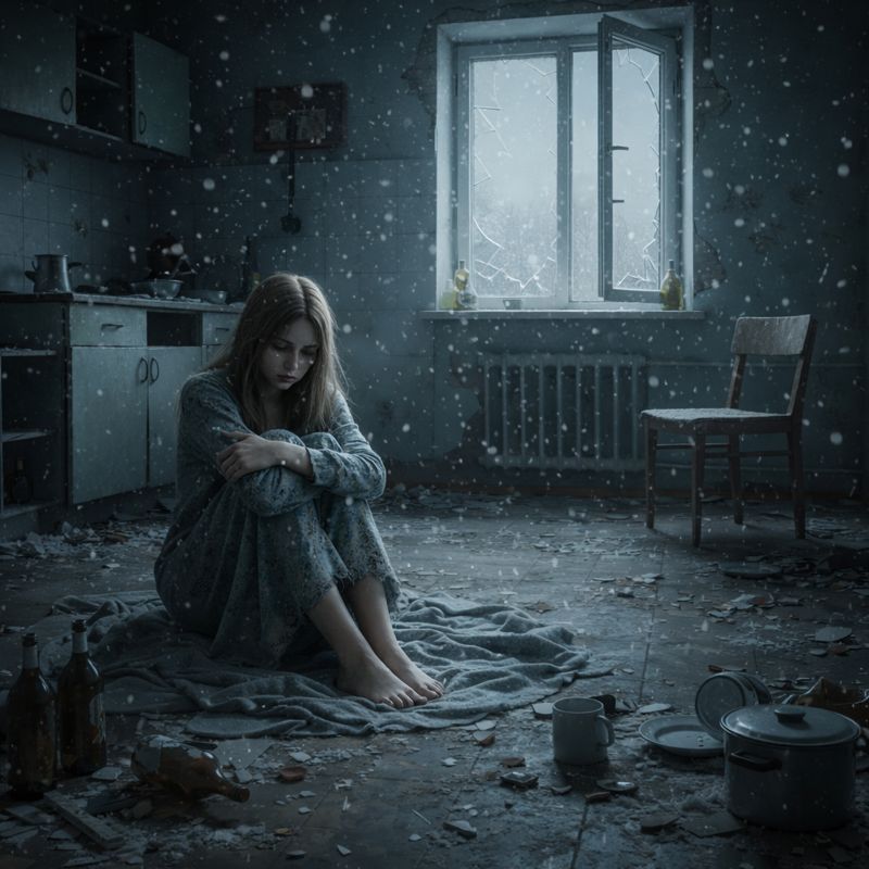 Алёнка проснулась от жуткого холода. Она встала и свесила ноги с кровати. Одеяло валялось на полу, форточка открылась от ветра и снежинки то и дело норовили попасть к ней в комнату. Алёнка вышла в коридор, везде валялись бутылки, огрызки, а из кухни то и дело доносились пьяные голоса. Алёнка тяжело вздохнула, опять у нас гости… Она понуро побрела обратно в комнату, мать не любила, когда Алёнка мешала ей, поэтому просить кушать было бессмысленно.