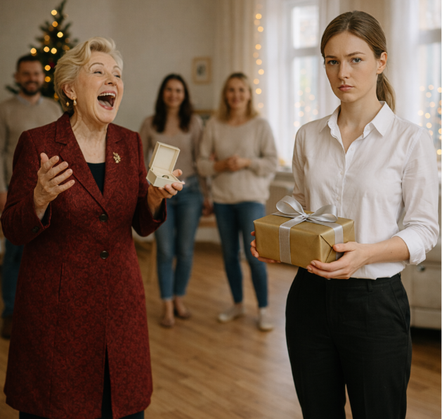 Все присутствующие мгновенно замерли в ожидании. Аврора медленно достала из своей сумочки элегантную коробочку с красивой атласной лентой — узнаваемую фирменную упаковку престижного ювелирного магазина. Торжественно положила на стол прямо перед свекровью.