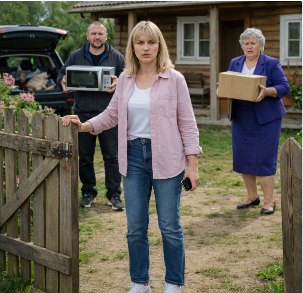 На крыльце стояла Зинаида Фёдоровна с коробкой в руках. Денис выносил из дома микроволновку.