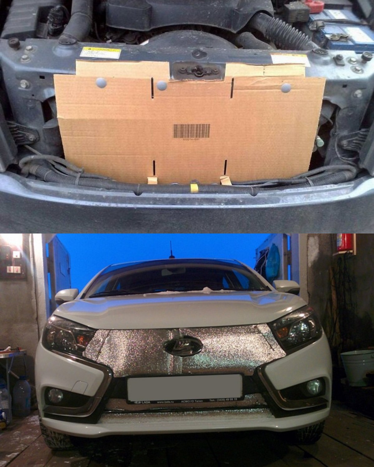 Лично я ставил картонки в те автомобили, где это было возможно (где была щель над радиатором). Сейчас эта часть в автомобиле закрыта пластиком и картонку не вставишь. Но я продолжаю закрывать радиатор со стороны решетки утеплителем из вспененного полиэтилена с фольгой (одно из названий — изолон). И, вот для чего.