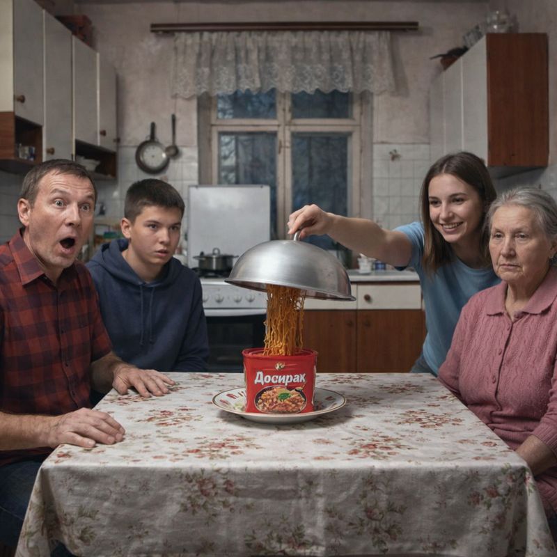 Игорь и Раиса сидят за пустым столом. Перед ними заваренный «Доширак». Лица такие, будто они хоронят хомячка.