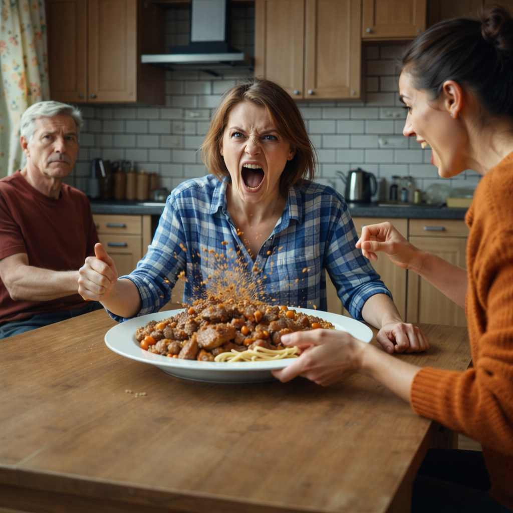 Время застыло. Куски мяса медленно сползали по ее щекам, соус капал с носа на кружевное жабо, кусок вареной моркови застрял в пышной прическе. Она сидела с открытым ртом, хватая воздух, и напоминала клоуна после неудачной репризы. Её глаза расширились от абсолютного, животного неверия в происходящее.