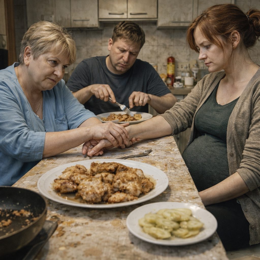 — Голод не тётка, потерпишь, — отрезала свекровь, накладывая себе второй мяса. — Я двоих выносила, на одной картошке сидела, и ничего, богатыри выросли, а вы, нынешние, только о брюхе своём думаете. Олег, ну скажи ей!