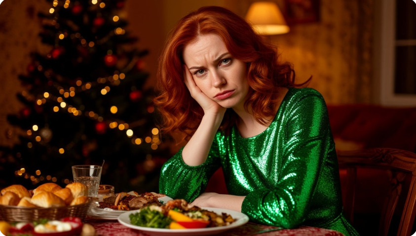 Стол ломился. Салаты в хрустальных вазочках, нарезки, какие-то рулетики, тарталетки, заливное. В центре стояла курица — тёмная, странно обгоревшая по краям.