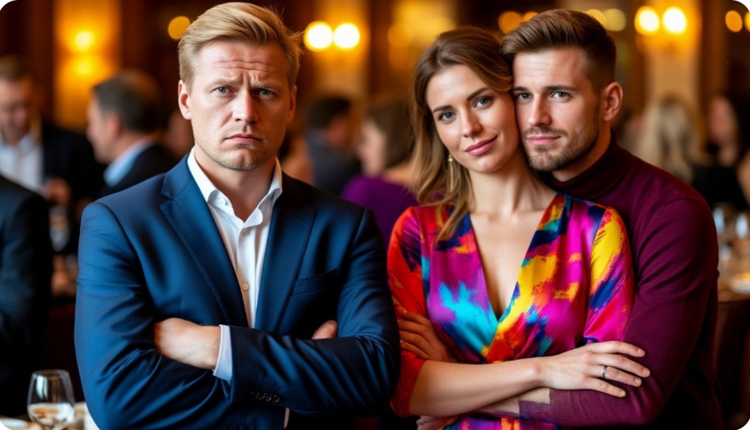 Валера смотрел, как Лариса пересекает зал. Её шелковое платье мелькало между столиками. Гости обернулись, замерли с бокалами в руках. Кто-то из коллег неловко прокашлялся. Тётя Зина перестала есть салат и уставилась на племянницу. Официант застыл с подносом у стены.