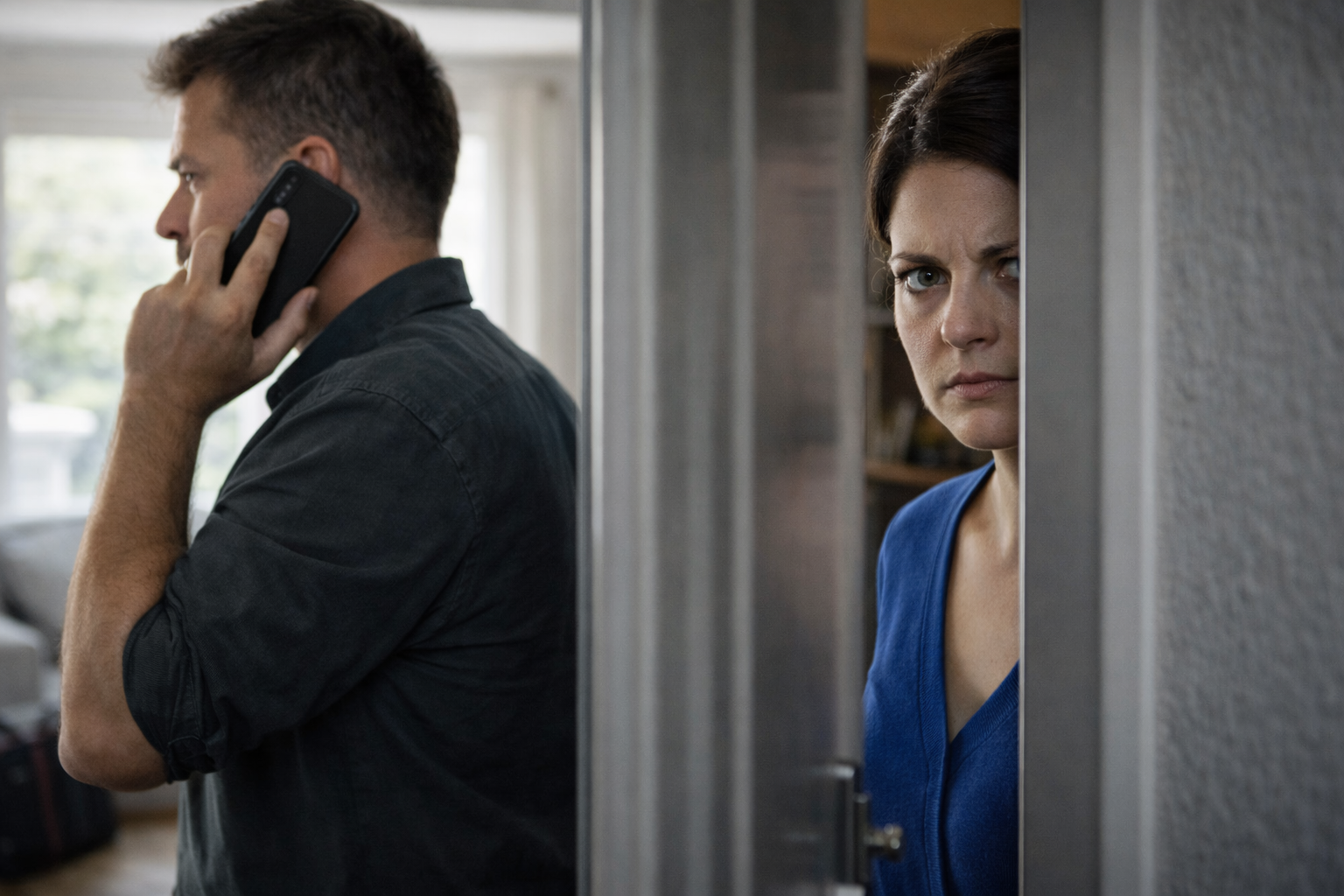 Она прошла в гостиную тихими шагами, встала в дверном проёме, скрестила руки на груди и просто стояла, глядя на мужа. Олег обернулся через несколько секунд, случайно бросив взгляд в сторону двери, увидел её, и на его лице на короткое мгновение мелькнула неподдельная растерянность. Глаза расширились от неожиданности, брови удивлённо поползли вверх, рот приоткрылся, будто он хотел что-то сказать, но не нашёл слов. Но телефон из рук он не выпустил, не бросил трубку испуганно, не попытался резко свернуть разговор на полуслове. Просто застыл на месте на секунду-две, глядя на неё широко раскрытыми глазами.