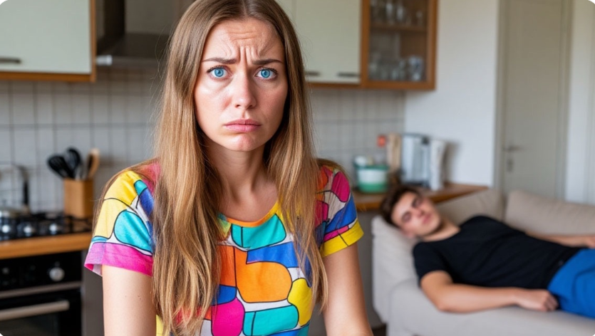 Диван в её однушке превратился в личное место обитания — подушки раскиданы, плед волочится по полу, а рядом горка грязной посуды, которую он обещал помыть потом. На журнальном столике — крошки, пустые пачки от печенья, зарядки от телефона и планшета.