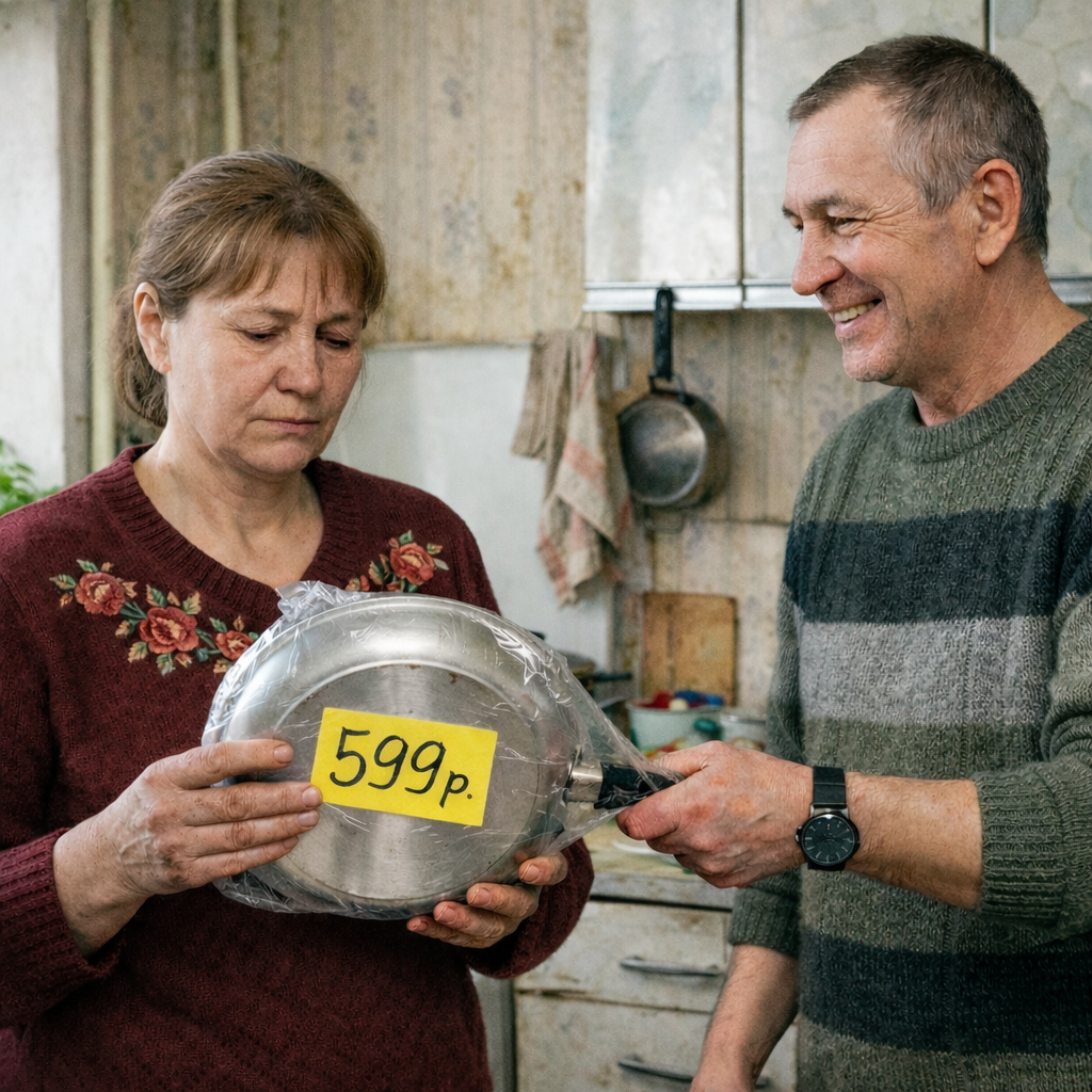 Я машинально взяла подношение. Внутри оказалась сковорода — легкая, как картонка, с дребезжащей пластиковой ручкой. Прямо на рабочей поверхности навсегда присох желтый ценник с надписью: «499 р.». Цифры смотрели на меня с наглым вызовом.