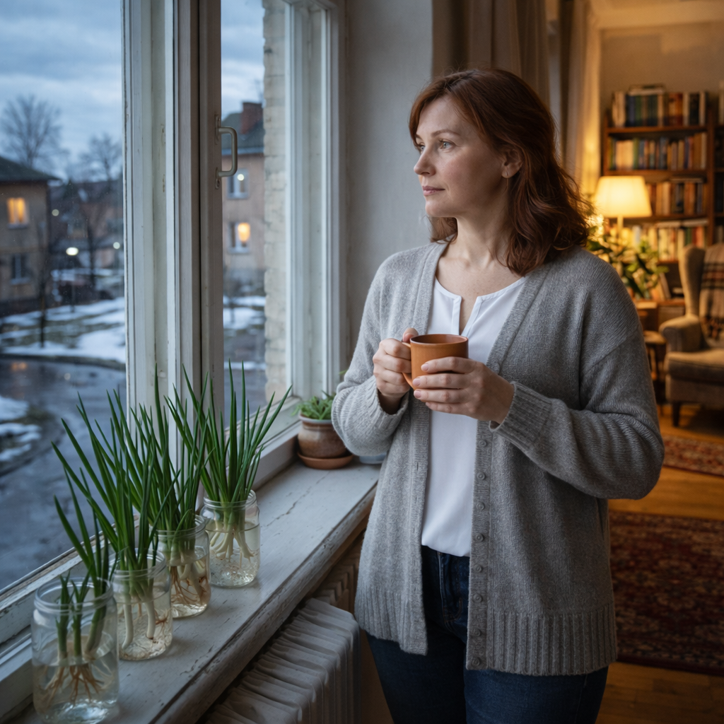 За окном — мартовское солнце, уже не прямо зимнее, но и не весеннее ещё. На окне появились ростки — зелёный лук, воткнутый в банку с водой.