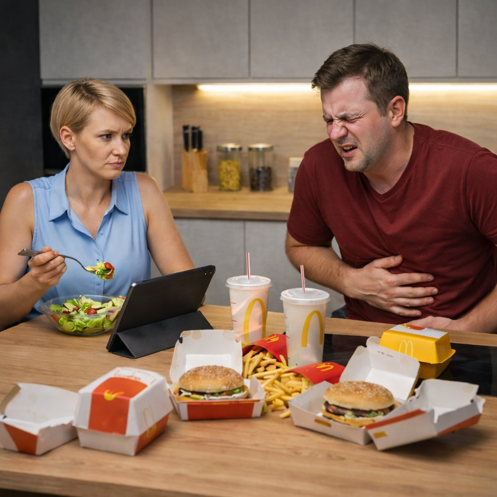Когда я вошла на кухню, Максим сидел за столом. Перед ним стояла тарелка с невнятным чёрным комком — кажется, это планировалось как яичница. На столе громоздились пакеты из супермаркета: он явно закупился впрок, хаотично и дорого. Тут были и готовые нарезки, и какие-то консервы, и три вида хлеба.