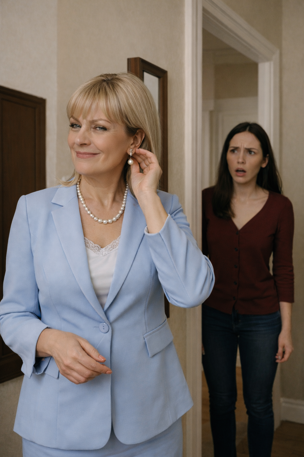Поднявшись на цыпочках, Татьяна подошла к приоткрытой двери спальни. То, что она увидела, заставило ее челюсть отвиснуть: Людмила Сергеевна стояла перед зеркалом в спальне, примеряя колье с сапфирами, которое Татьяна получила от родителей на свадьбу.