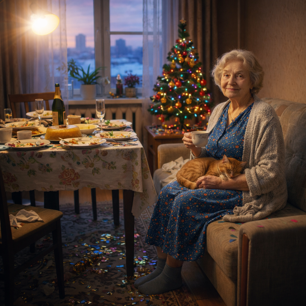 Когда все ушли, Зинаида Петровна осталась одна. В квартире было тихо, пахло едой и хлопушками. На столе высилась гора грязной посуды. На полу валялось конфетти.