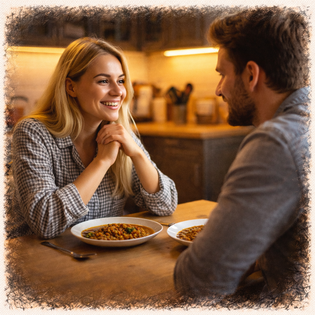 Я просто предложила ему зайти — один вечер, один суп. Он был разведен, я — после неудачного романа. Мы молчали, ели, и никто из нас не подумал, что вот так, без цветов и обещаний, кто-то может стать родным.
