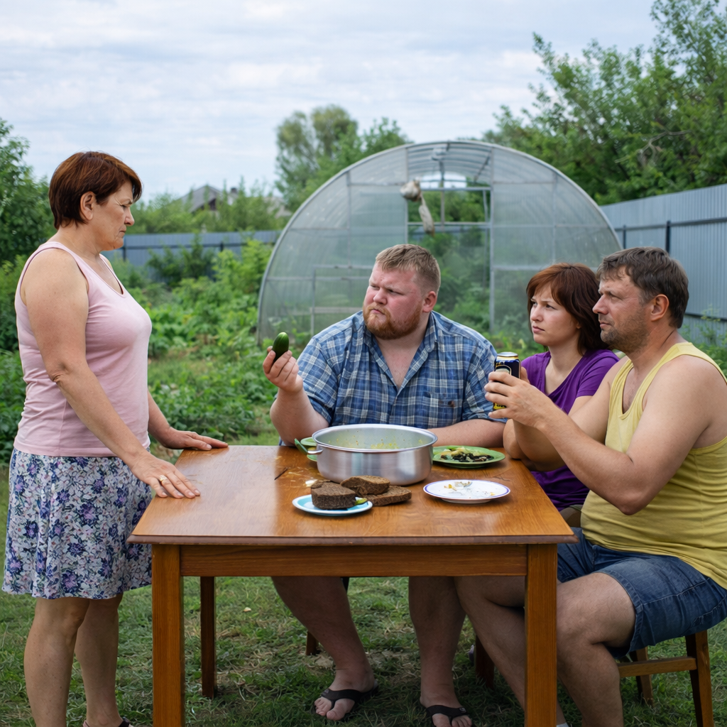 Нина стояла посреди всего этого и считала. Не деньги — время. Пятница — подготовка, десять часов. Суббота — рассада, грядки, шесть часов. Среда — закупка и дорога. Три дня — готовка, уборка, стирка. Она потратила неделю, чтобы шестеро человек бесплатно отдохнули на её труде, на её продуктах, на её белье, и уехали, не помыв за собой тарелку.