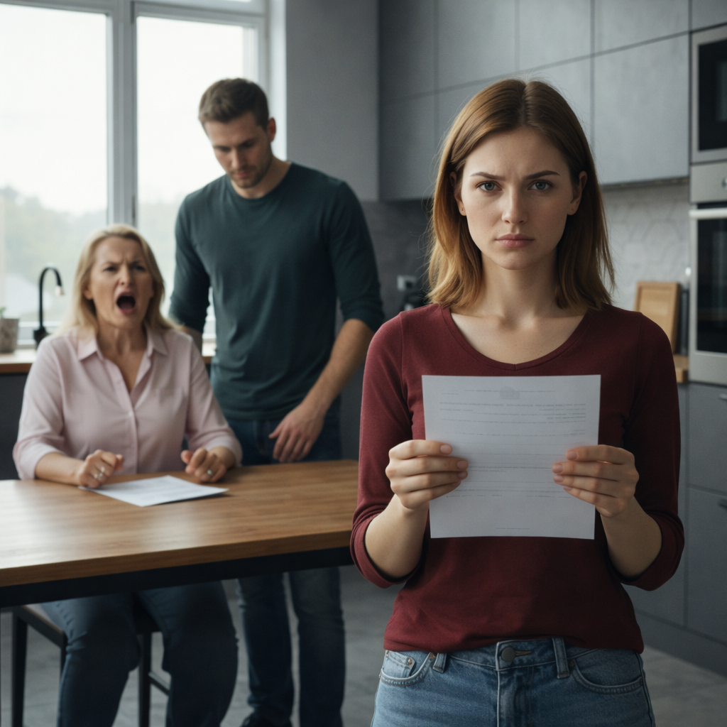 Ольга сбросила сапоги у порога спальни, открыла шкаф, достала с верхней полки папку с документами. Вытащила лист с синей печатью и вернулась на кухню. Положила бумагу перед свекровью.
