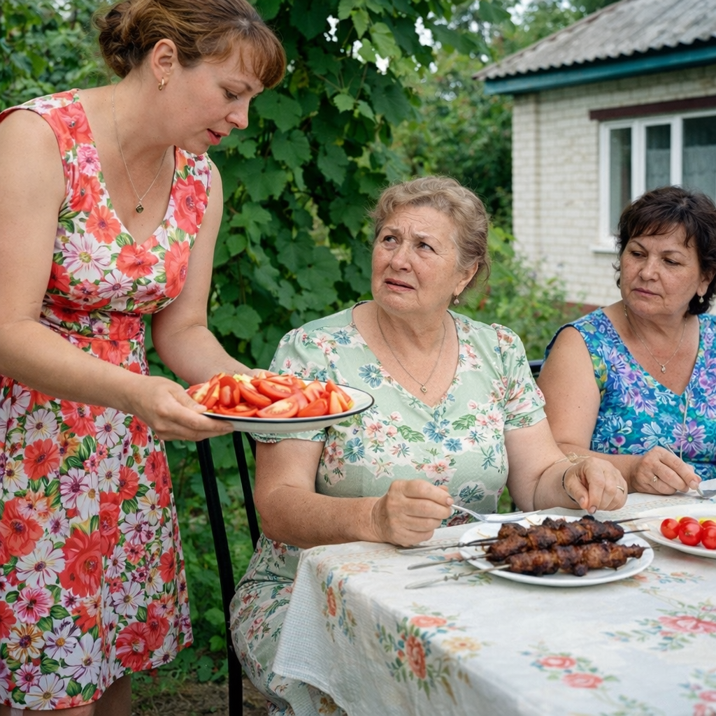 Она взяла блюдо с шашлыком — аккуратно, двумя руками — и отодвинула его от свекрови. Поставила на другой край стола, подальше.