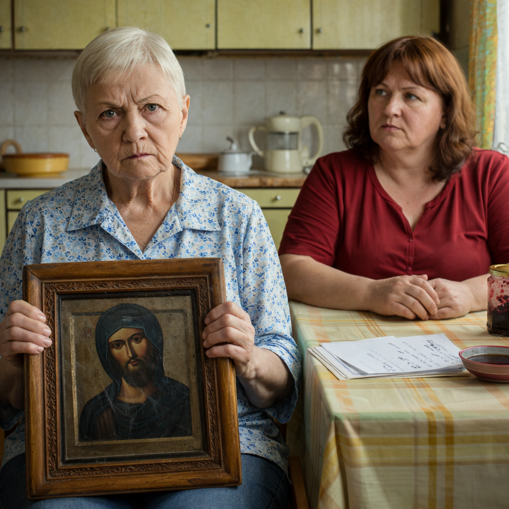 Настя взяла икону и, к удивлению всех, включая саму себя, расплакалась. Не из-за обряда, а потому что бабушка стояла перед ней маленькая, в синем костюме, и руки у неё подрагивали.
