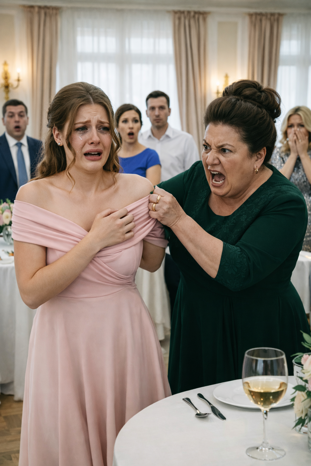 Шорох дорогого шёлка, разрываемого с тупой, животной яростью, прозвучал в зале «Лазурного зала» подобно выстрелу. Музыканты на небольшой сцене синхронно сбились с такта, а официант, застывший с подносом фужеров, позволил себе редкую оплошность — капля красного вина скатилась по хрусталю и упала на белоснежную скатерть, оставив крошечное, но вызывающее пятно.