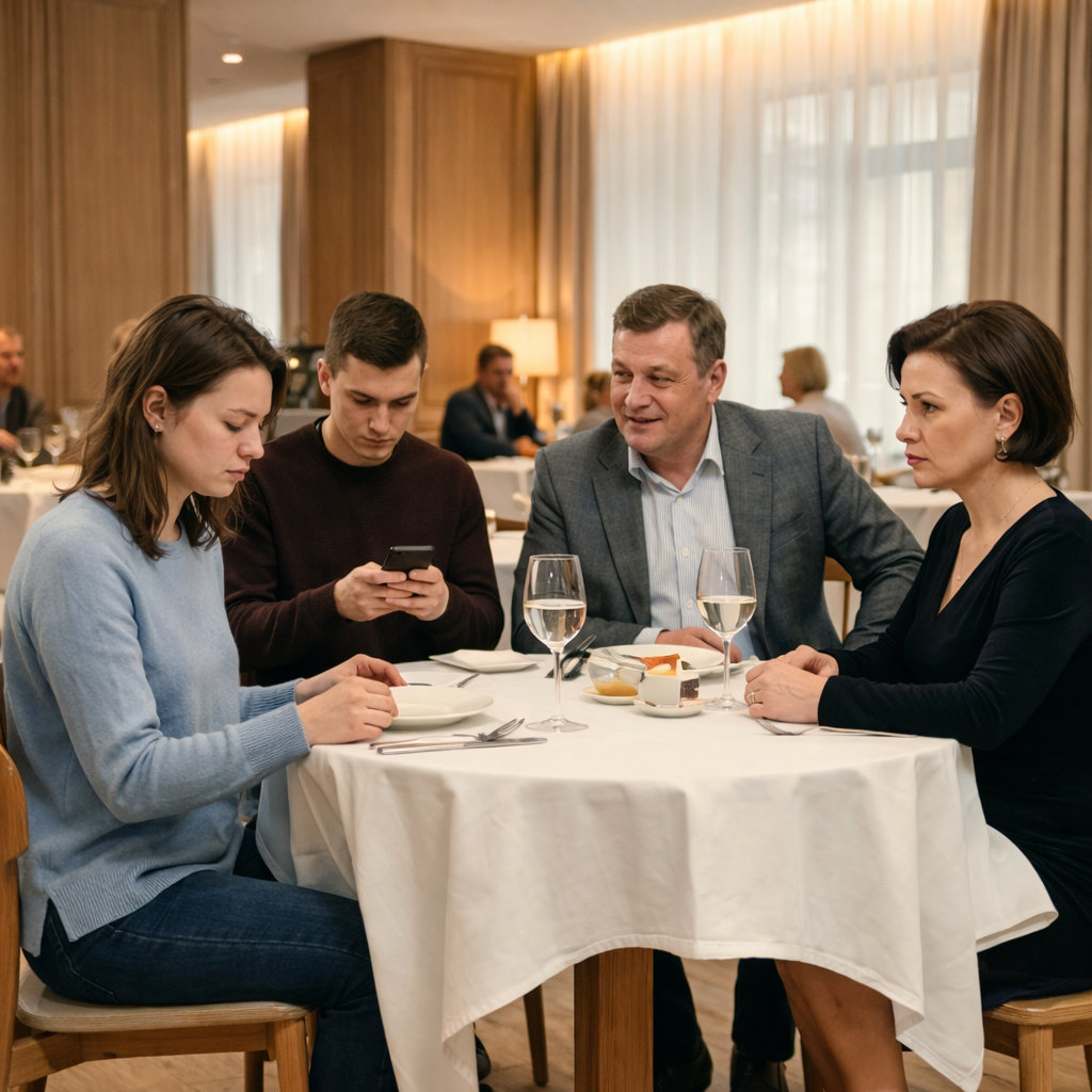 Римма Аркадьевна, мать Станислава, сидела, вытянувшись в струнку. Она демонстративно отодвинула от себя тарелку с закуской и поджала губы. Напротив тяжело опирался на столешницу Эдуард Звонарёв — грузный, властный мужчина. Его пальцы с массивным перстнем нетерпеливо выбивали дробь по хрустальному стакану с водой. Сам Станислав сидел с краю, методично прокручивая ленту в телефоне.