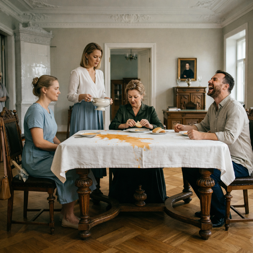 — Ой, — сказала Лидия. Голос был сухим, как старый пергамент. — Соскользнула. Рита, ну что ты застыла? Вытирай давай. И скатерть сразу в застирку, а то пятно въестся.