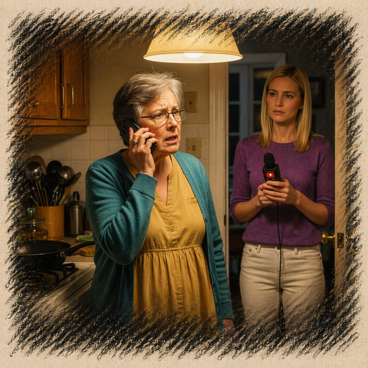 Она появилась в дверном проёме. В синем халате, в тапочках. В руках — тряпка. Как будто только что мыла стол. Я посмотрела на её руки. Тряпка была сухая.