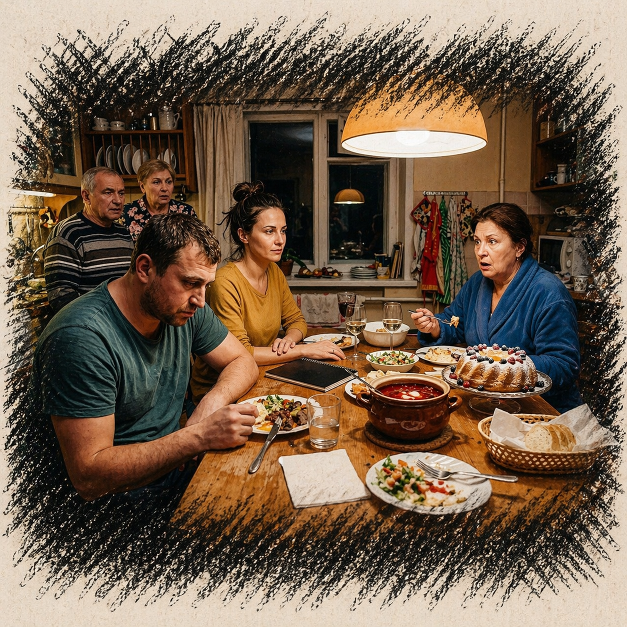 Солонка стояла ровно посередине стола, между тарелкой свекрови и селёдкой под шубой. Ирина помнила этот ритуал тринадцать лет: чуть левее, и борщ будет недосолен, чуть правее — пересолен. Её рука, ставившая солонку, давно делала это автоматически. Она отступила на шаг, вытерла ладони о фартук в горошек, на котором давно проступили жирные пятна от брызг масла, и окинула взглядом кухню.