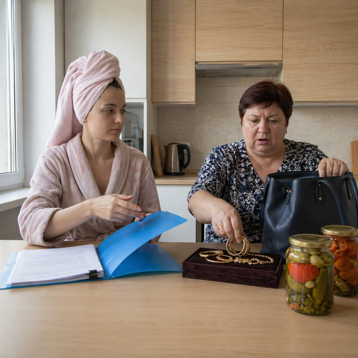 Рука свекрови застыла над открытой сумкой.