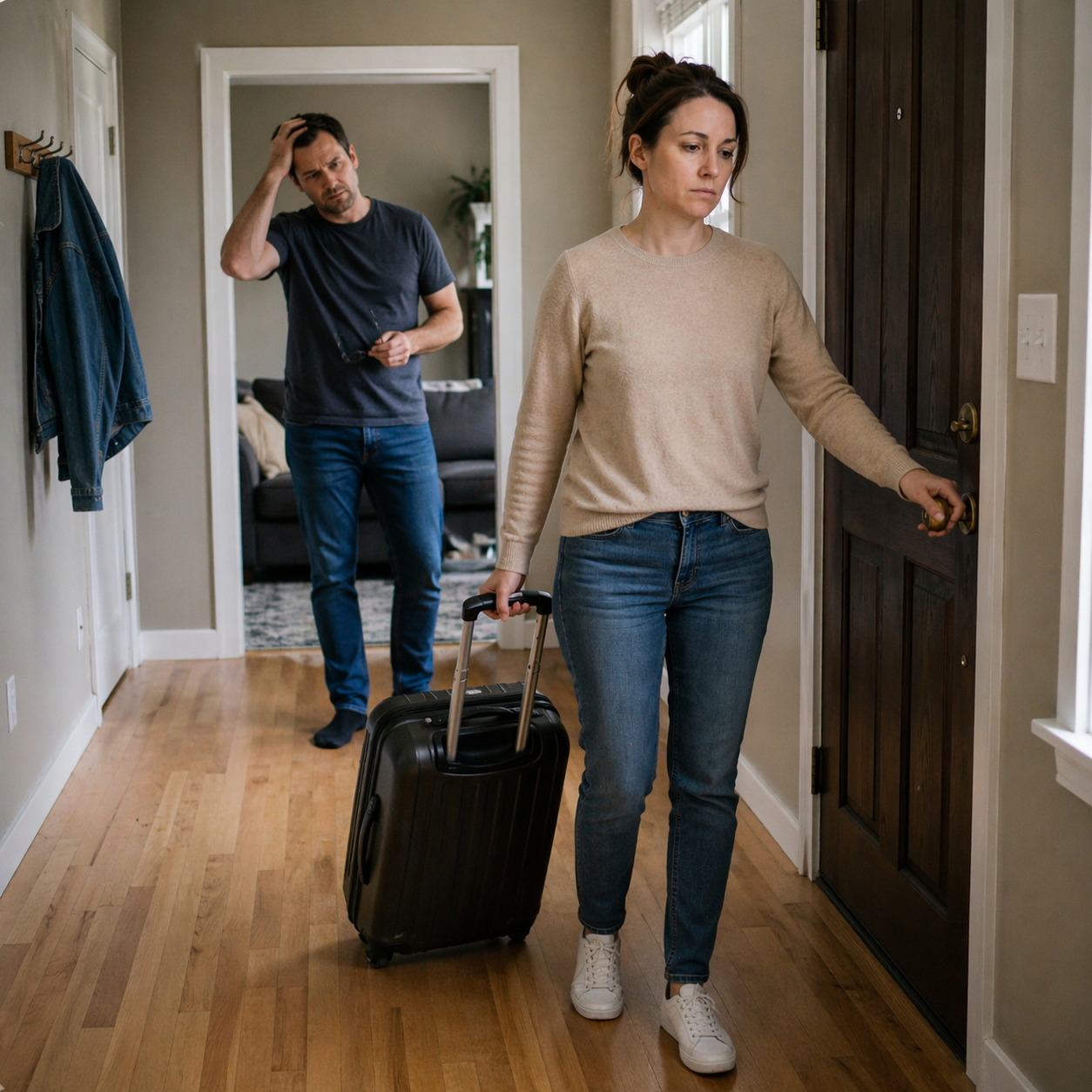 Мой чемодан стоял у двери в прихожей. Небольшой, на колёсиках. Рядом — сумка с ноутбуком и папками. Я вышла из спальни уже одетая, в простых джинсах и свитере. Не в домашнем халате.