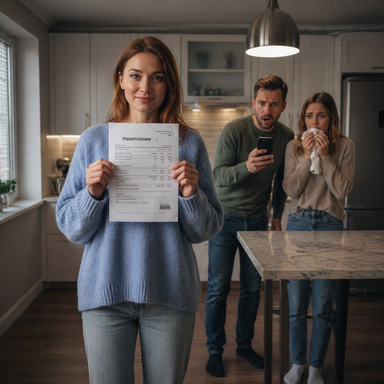Он шумно выдохнул и выдал то, от чего у меня потемнело в глазах: — Короче. У тебя на вкладе лежит два миллиона восемьсот. Завтра идешь в банк, снимаешь всё, и мы закрываем долг Алины. А на квартиру… ну, потом накопим. Ничего страшного, поживем на съеме еще пару лет.