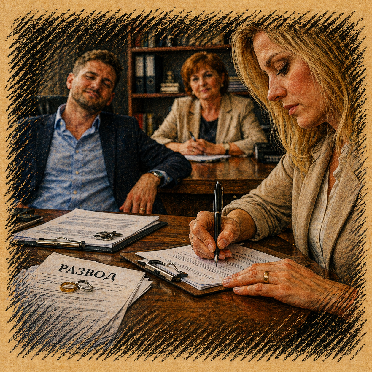 Рука Андрея скользнула по бумагам с такой лёгкостью, будто он подписывал не развод, а путёвку в новую жизнь. Я молча взяла ручку. Пять лет брака умещались в три листа.