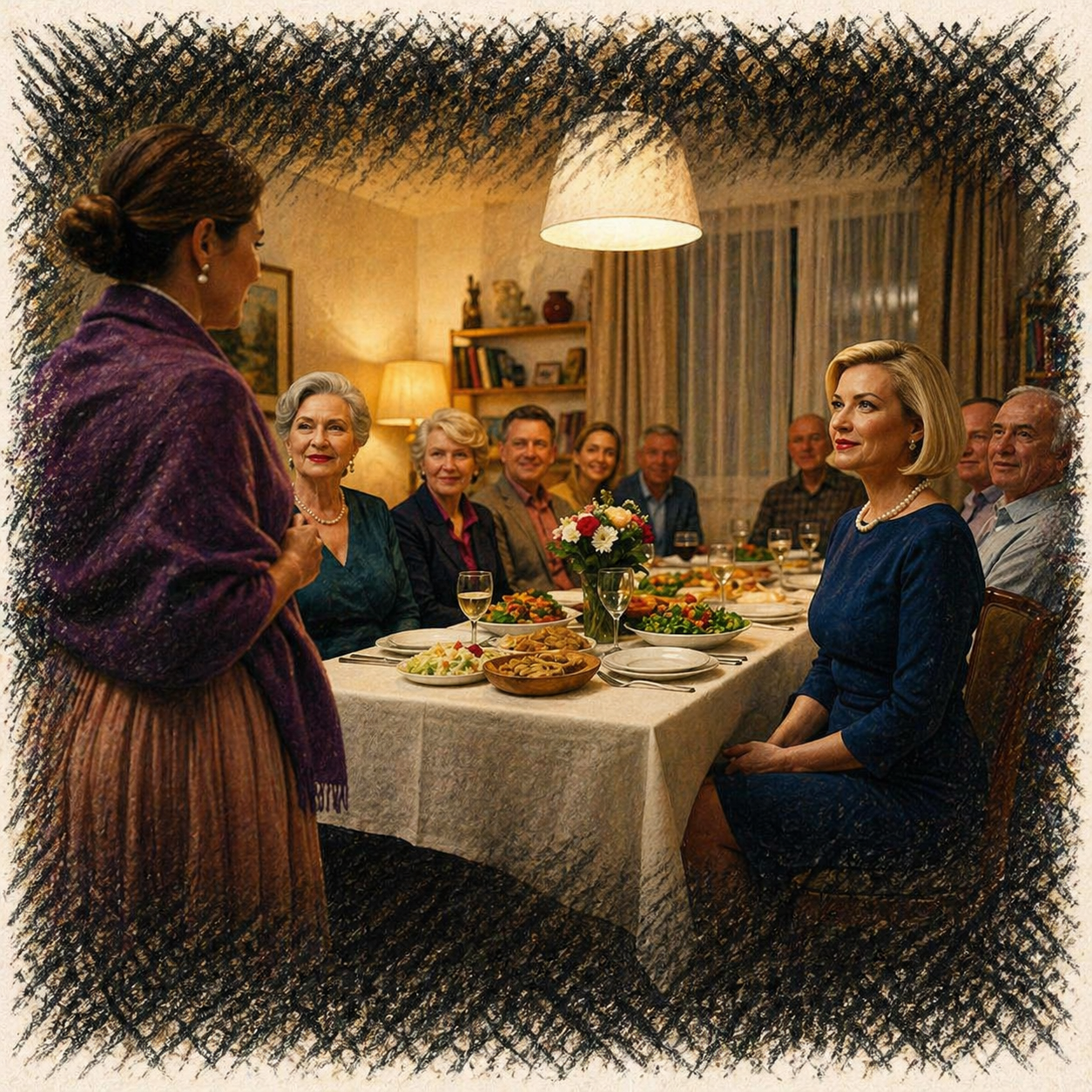 Длинный стол, белая скатерть, салаты в хрустальных салатниках, бутылка шампанского, бутылка лимонада для Егора. Дядя Слава за столом, красный, уже выпивший. Тётя Галя рядом, в очках. Свёкор, Николай Иванович, во главе стола, сутулый, седой, тихий.